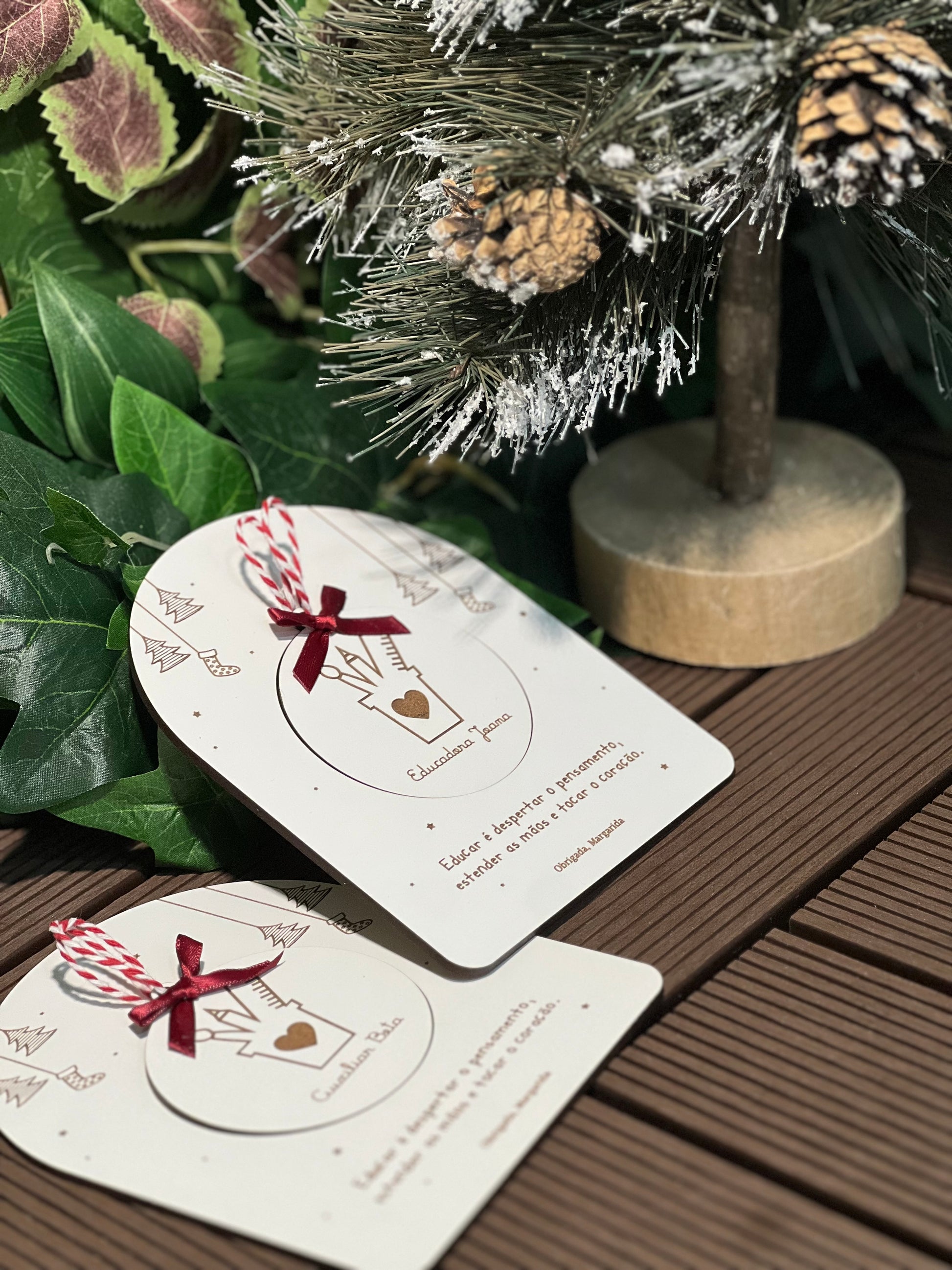Feito em bétula natural ou mdf branco, este ornamento vem numa placa gravada a laser com uma mensagem de agradecimento e inclui um ornamento destacável com o nome da pessoa — que pode depois ser pendurado na árvore.